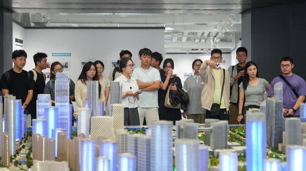 “我们现在所在的位置是钱江新城,是杭州市实施‘拥江发展’战略的桥头堡。”听着讲解员的介绍,看着钱江新城的沙盘,新生们直观感受着杭州城市建设的宏伟蓝图与现代化发展成就。