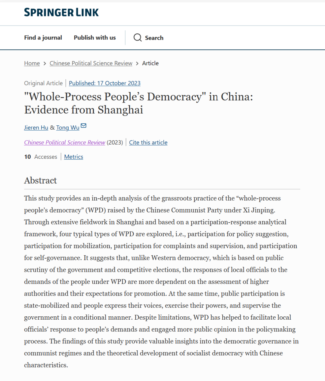 近日,我院副教授胡洁人与其合作者华东师范大学社会发展学院副教授吴同,在国际学术期刊Chinese Political Science Review(SSCI Q1区间杂志,影响因子:3.2)合作发表"WholeProcessPeople’s Democracy" in China: Evidence from Shanghai 论文。
