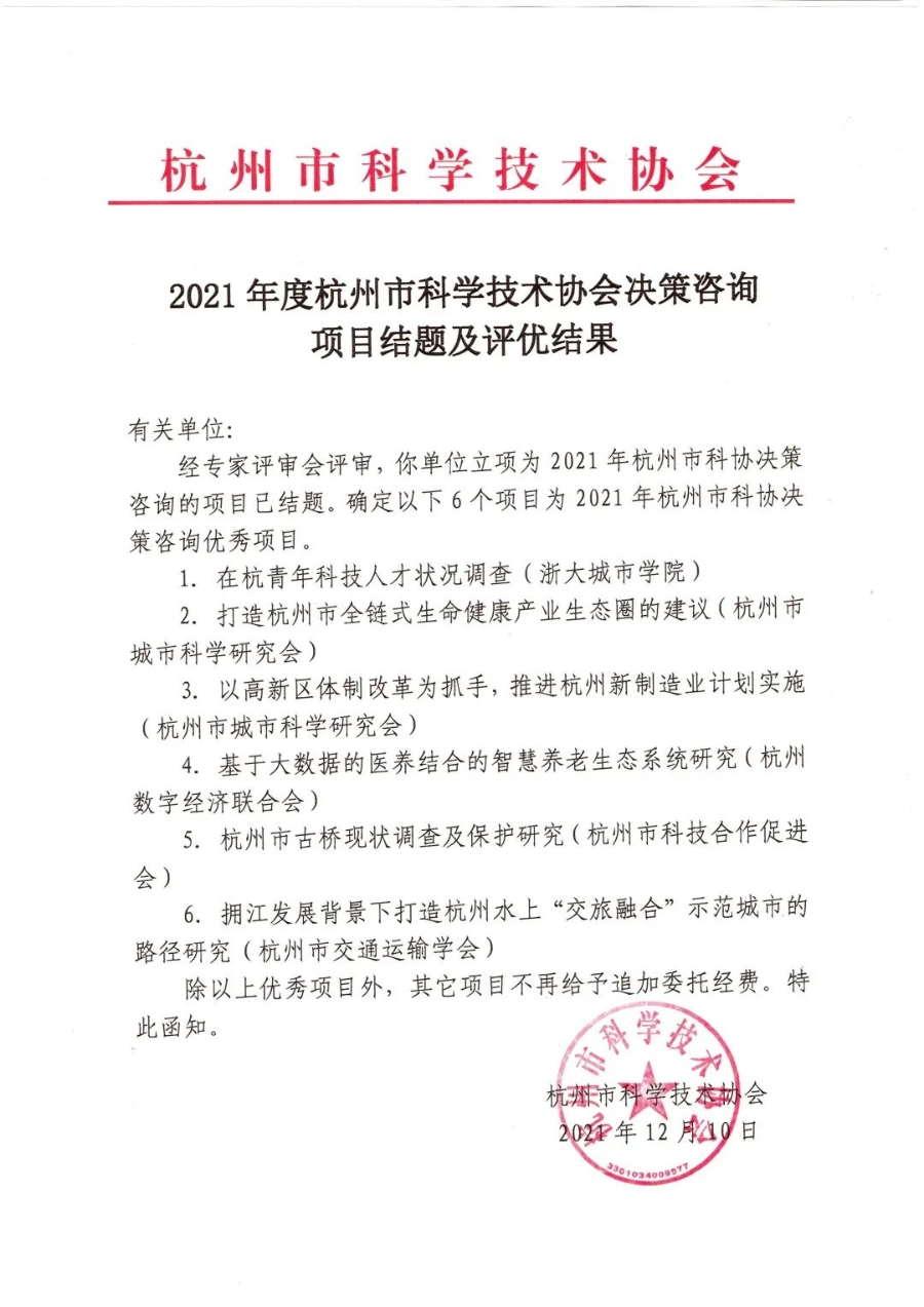 2021年度杭州市科学技术协会决策咨询项目结题及评优结果通知