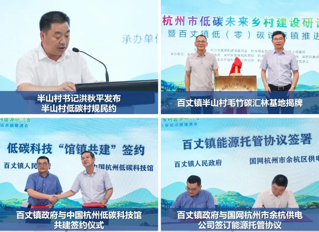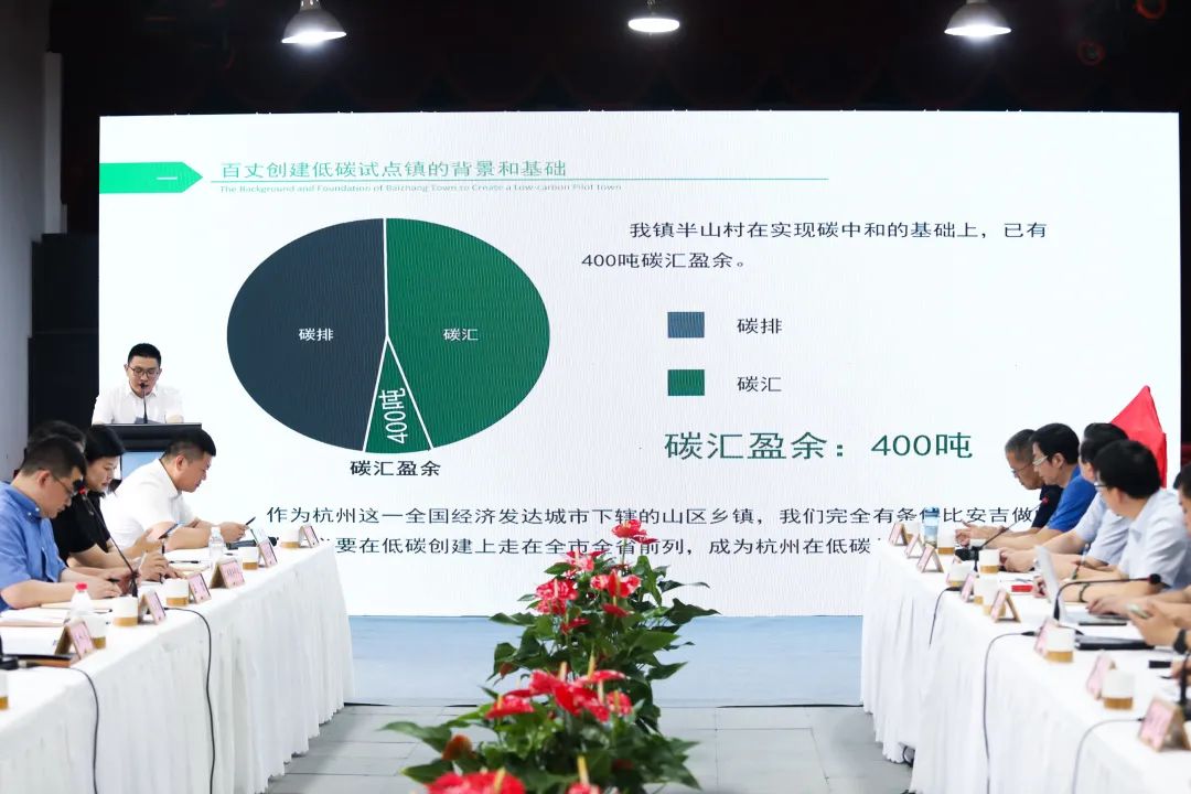 作为浙江省和杭州市的低碳试点创建乡镇,低碳是百丈镇发展的战略选择。会上,百丈镇党委书记陈时忠汇报了百丈镇低(零)碳试点镇建设情况。自试点建设以来,百丈镇围绕低碳村、低碳社区、低碳生活、低碳园区、低碳景区建设五个低碳应用场景,已形成农林、竹加工、文创、电子商务、主题节庆等多元化、特色化的主题绿色产业体系,并且在镇村碳排放测算、倡导低碳生活方式、减污降碳协同治理和碳汇指标交易方面取得了阶段性的成果。此外,还展示了百丈镇部分低碳试点创建成果,包括发布了全国首个低碳村规民约;携手中国杭州低碳馆开展“馆镇共建”等。