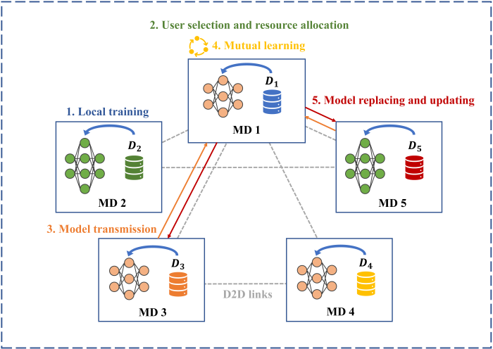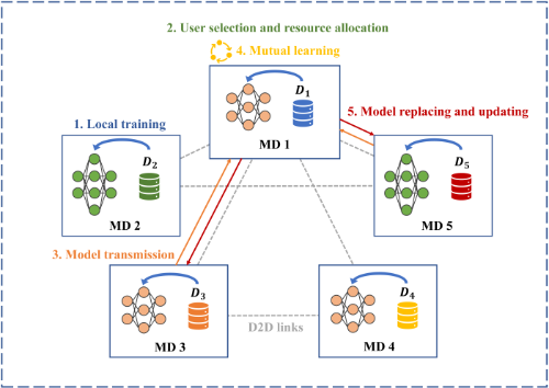 卢骁以第一作者身份撰写的论文为“Energy-Efficient User Association and Resource Allocations for Decentralized Mutual Learning”。该工作利用了相互学习的优势,创新性地设计了一种全新的去中心化相互学习(Decentralized Mutual Learning,DML)系统,同时构建了一个以最小化移动设备间共享知识时的平均通信能耗为目标的非凸优化问题。为解决上述非凸优化问题,作者又进一步提出了基于粒子群优化(Particle Swarm Optimization,PSO)的外层算法和基于分式和优化的内层迭代算法,它们分别用于设计高效的用户分组策略和实现最优的通信资源调度。仿真结果验证了该算法的快速收敛性和有效性。