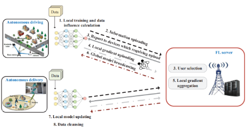沈熠能以第一作者身份撰写的论文为“Storage-aware User and Spectrum Resource Scheduling for Federated Learning with Data Cleansing”。 论文针对传统联邦学习(Federated Learning,FL)框架在求解数据隐私问题中的缺陷,创新性地提出了一种更先进的联邦学习与资源调度算法。论文提出的算法主要创新点为:(1)将数据清洗引入并扩展到联邦学习系统,并分析数据评估方法在分布式学习下的误差;(2)基于概率选择的系统框架而构建的综合数据量、数据影响力、传输时延的凸优化问题;(3)为最小化传输时延而构建的一个在多用户间分配带宽的凸优化问题。仿真结果验证了算法的收敛性,同时验证了它对与解决数据隐私与数据存储的有效性。