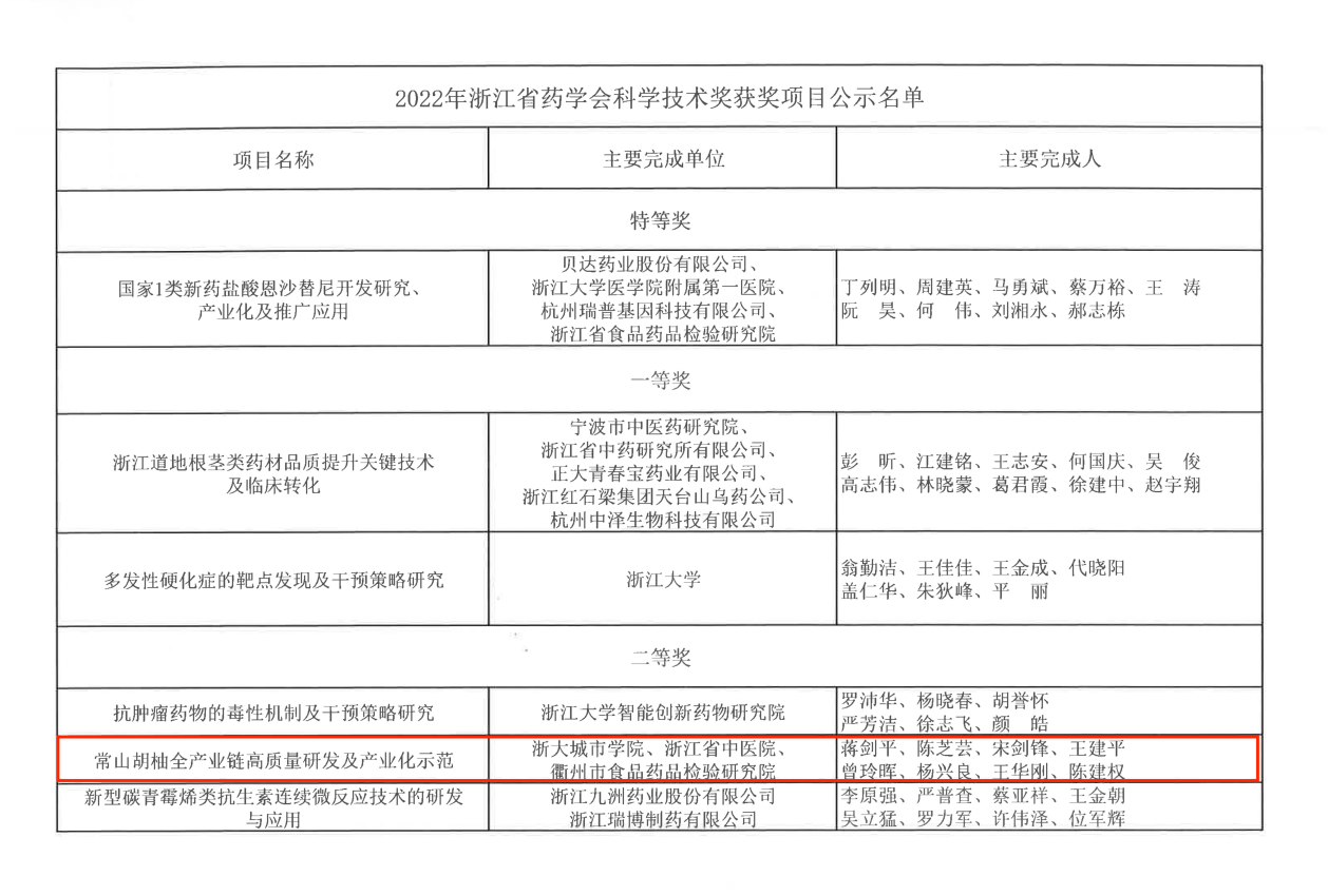 近日,2022年浙江省药学会科学技术奖评审结果揭晓,经省药学会组织申报、形式初审、专家评审,蒋剑平副教授主持申报的常山胡柚全产业链高质量研发及产业化示范项目,荣获2022年浙江省药学会科学技术二等奖。