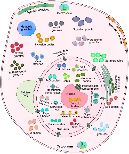 在真核细胞中,生命活动被有序地分配一个个细胞区室或细胞器中完成。典型的有膜的细胞器已经被广泛研究,然而细胞中还存在着丰富的,功能多样的无膜细胞器(MLOs)。近十年来,随着实验方法和技术的进步,有关MLOs的研究蓬勃发展,这加深了我们对MLOs的不同组成和功能的理解。MLOs在细胞形成、信号转导、核糖体生物合成、有丝分裂和不对称分裂等生物过程中发挥着重要作用。被称为液-液相分离(LLPS)的生物物理过程阐明了动态的生物分子组装是如何形成MLOs。蛋白质,DNA,RNA可以驱动LLPS的形成。同时,大量研究也表明LLPS功能障碍引起的异常蛋白质聚集是癌症中的一个关键诱因。因此,深刻地理解与癌症相关的相分离和凝聚,将会给我们提供全新的癌症治疗思路和手段。