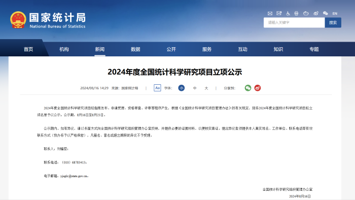据悉,全国统计科学研究项目面向全国申报,选题参照国家统计局发布的课题指南确定。2024年度全国统计科学研究项目共立项153项,其中重大项目10项、重点项目40项、优选(一般)项目103项。