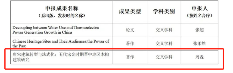近日,第九届高等学校科学研究优秀成果奖(人文社会科学)评选结果正式公布。我校国土空间规划学院建筑学系周淼副教授的著作《唐宋建筑转型与法式化:五代宋金时期晋中地区木构建筑研究》荣获青年成果奖。教育部高等学校科学研究优秀成果奖(人文社会科学)每三年评选一次,是目前国内人文社科领域最具公信力和影响力的重要奖项。