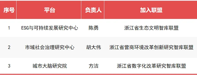 ESG与可持续发展研究中心聚焦ESG投资与创新研究、绿色转型与可持续发展研究等领域,致力于开展高质量应用型研究,并为党和政府、企业及相关单位提供决策咨询与服务。市域社会治理研究中心致力于市域社会治理现代化与营商环境法治化研究,为浙江全面打造一流营商环境,提升杭州超大城市治理能力贡献智慧。城市大脑研究院以“‘讲对、讲好、讲开’城市大脑”为起步,致力于以“城市大脑赋能城市治理”为端点延伸的治理理论与应用研究。
