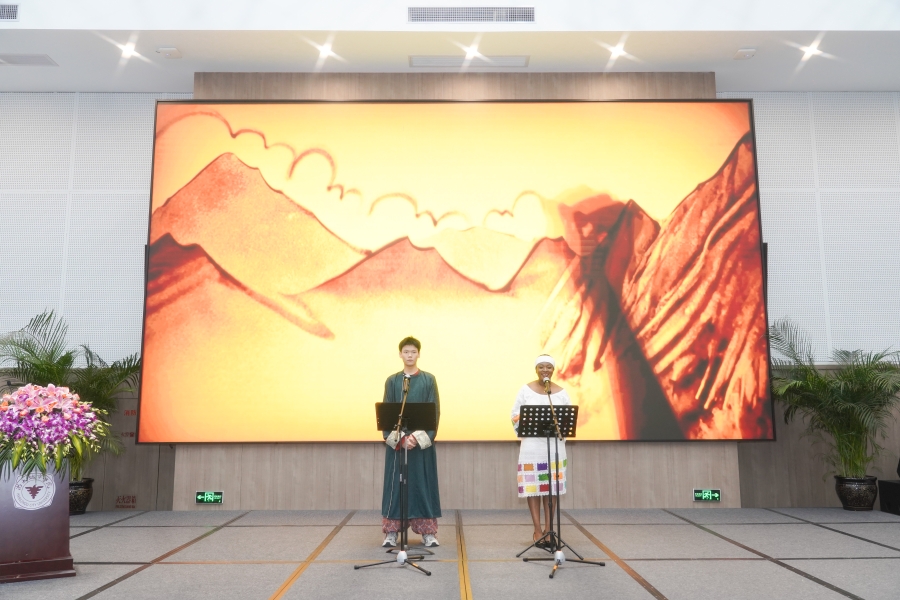 现场,原创诗歌作者、国际学生Charity与外国语学院的王晨骅共同朗诵了她创作的诗歌《百花齐放,继往开来》,以歌颂国际文化交流,倡导开放、包容的心态,共同推动世界文化繁荣发展。