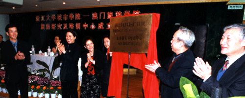 2002年1月30日,浙江大学城市学院与澳门旅游学院在城市学院成立“旅游研究及培训中心”,共同开展中外旅游专题研究和旅游人才培训。图为中心揭牌仪式。