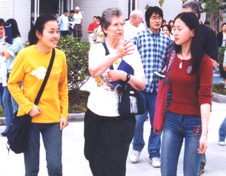 2002年4月,美国退休教师访问团应邀访问浙江大学城市学院。图为城市学院学生与来访的美国退休教师面对面交流。