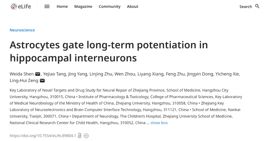 我校医学院曾玲晖课题组在eLife发文揭示星形胶质细胞参与海马中间神经元长时程突触传递增强的机制