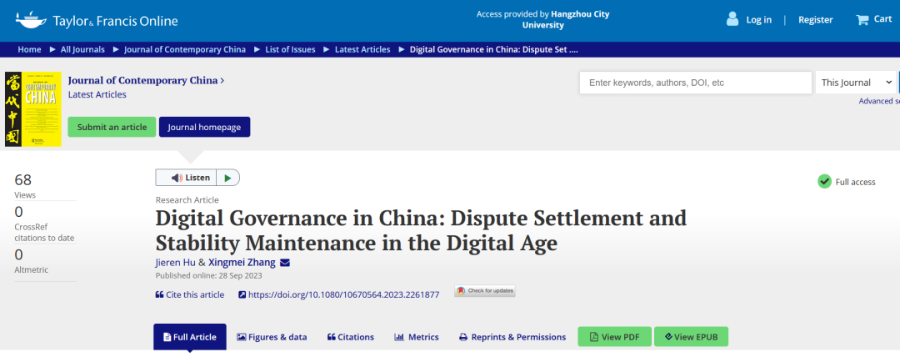 我校法学院胡洁人老师在Journal of Contemporary China学术期刊发表论文
