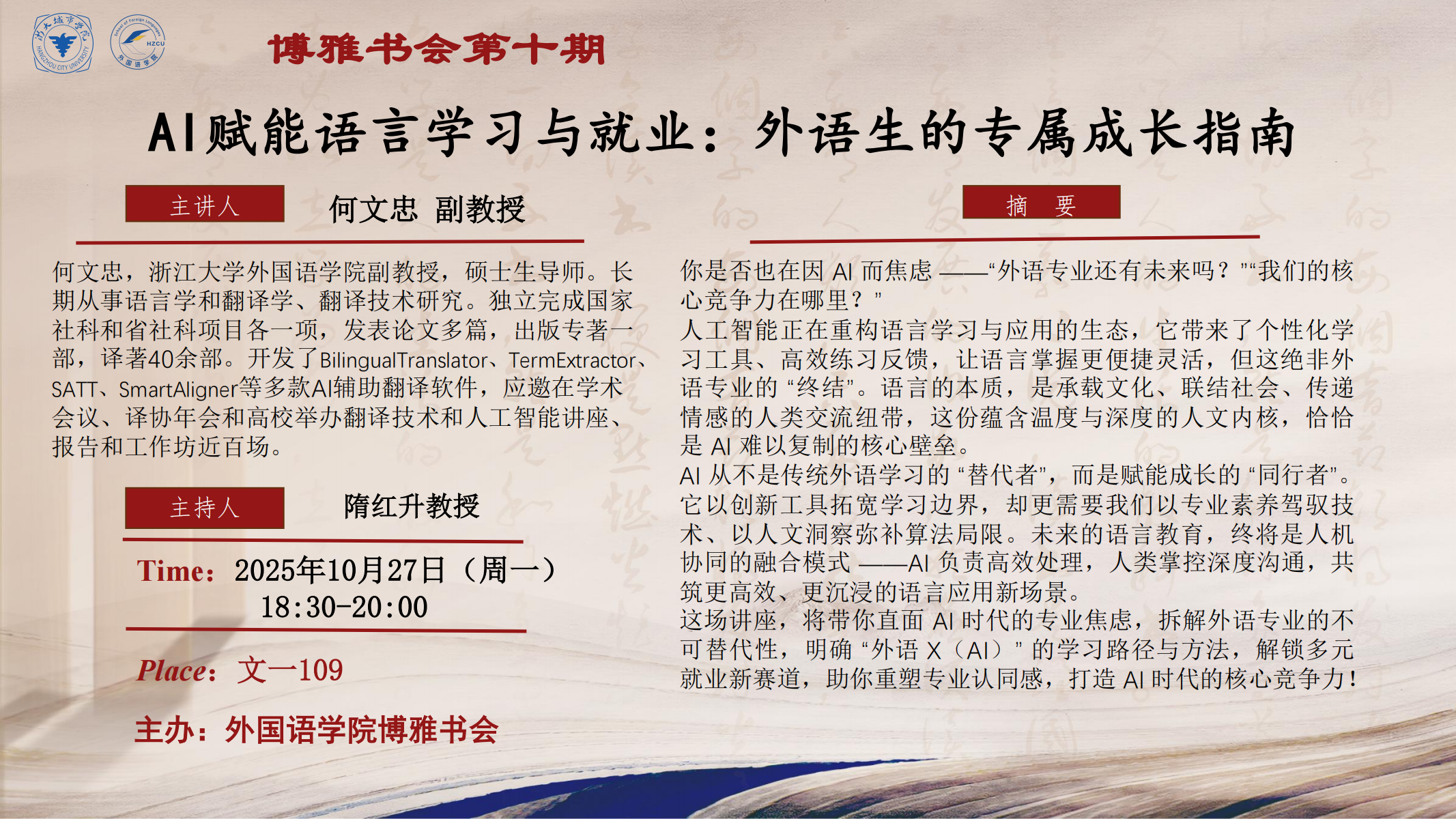 讲座AI赋能语言学习与就业:外语生的专属成长指南时间:2025-10-27 18:30