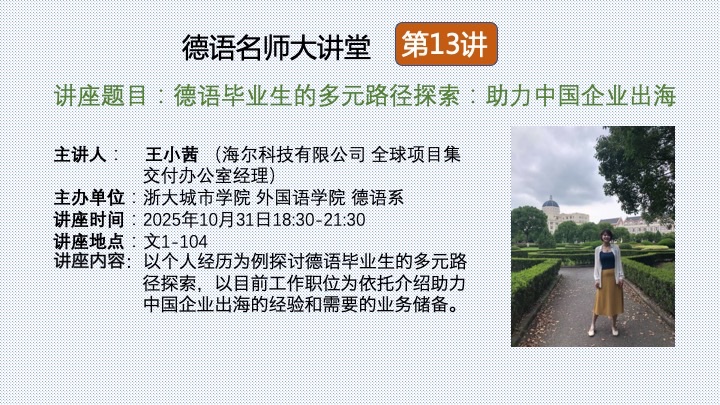 讲座德语毕业生的多元路径选择:助力中国企业出海时间:2025-10-31 18:30