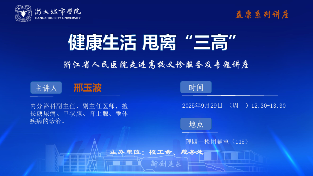 讲座《健康生活 甩离“三高”》--浙江省人民医院走进高校义诊服务及专题讲座时间:2025-09-29 12:30