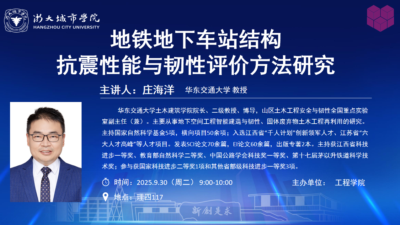 讲座地铁地下车站结构抗震性能与韧性评价方法研究时间:2025-09-30 09:00